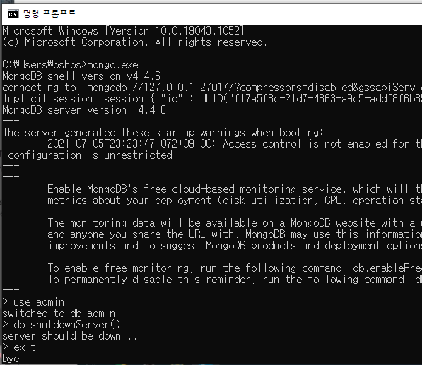 몽고 DB를 종료하기 위해서는 아래를 따른다