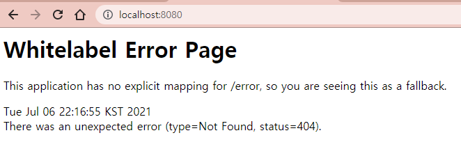 - Spring 서버가 정상 작동하는지 브라우저에서 localhost:8080 으로 확인해보자.