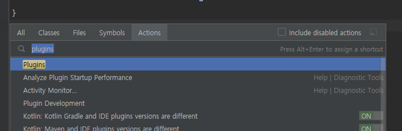 - Shift 를 두번 누르고, Actions 탭에서 plugins를 검색해보자.