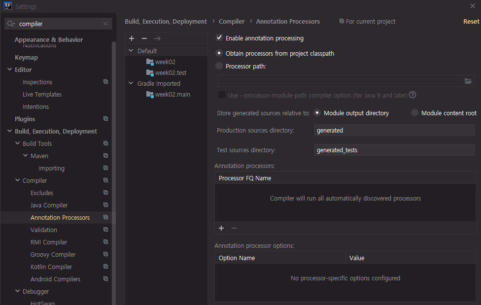 - intelliJ 설정으로 annotation processing을 켜주자.