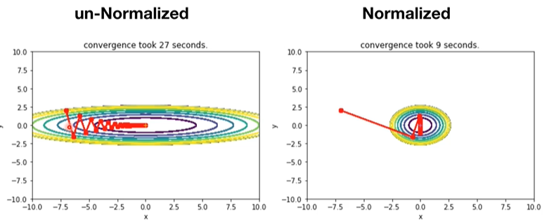 - 정규화 되지 않은 데이터는 원하는 값을 찾는데에 X, Y 축이 다른 분포를 가지지 때문에 각각의 반영이 다르게됨.