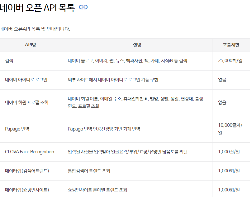 네이버 오픈 API 목록 NAVER Developers - API 소개 네이버 오픈API 목록 및 안내입니다. 네이버 오픈 API 목록 API명 설명 호출제한 검색 네이버 블로그, 이미지, 웹, 뉴스, 백과사전, 책, 카페, 지식iN 등 검