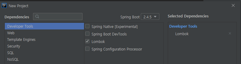Developer Tools 에선 Lombok만 선택한다.