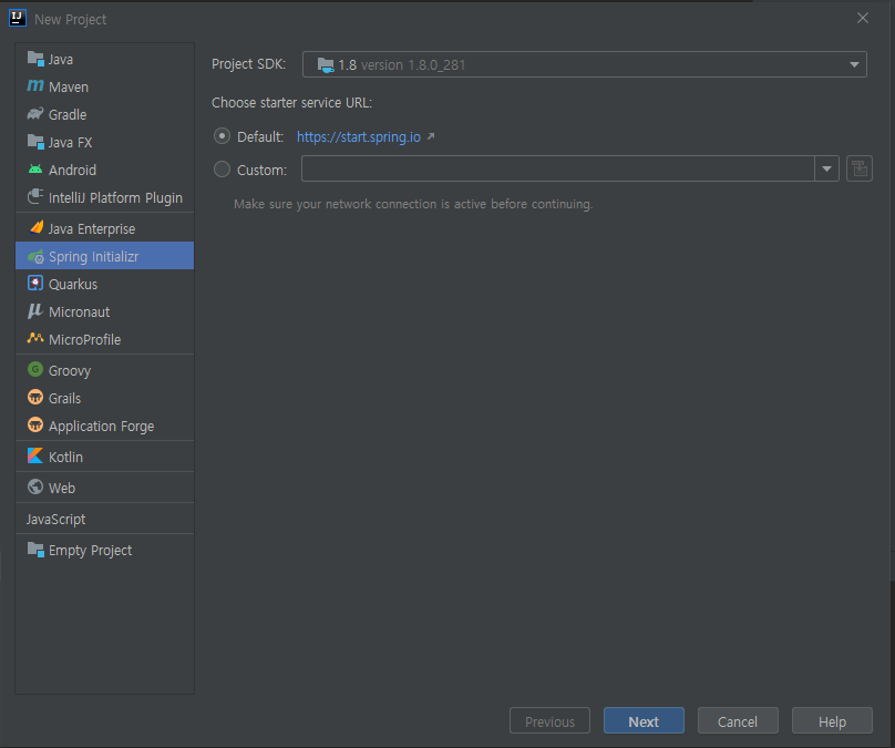 IDEA에서 New -> Project 에서 Spring Initializer와 SDK 1.8을 선택한다.