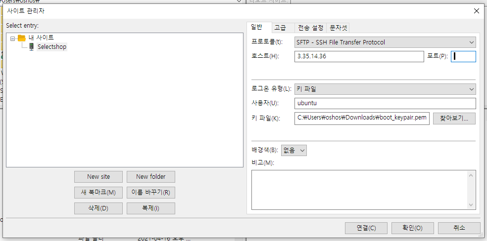 > 로그온 유형에 미리 다운받은 pem을 통에 연결