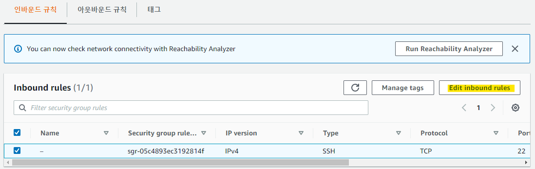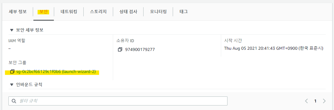 - AWS EC2 인스턴스에서 보안 탭의 보안 그룹 클릭