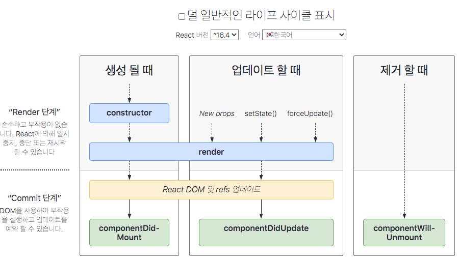 - 제거는 페이지를 이동하거나, 사용자의 행동(삭제 버튼 클릭 등)으로 인해 컴포넌트가 화면에서 사라지는 단계