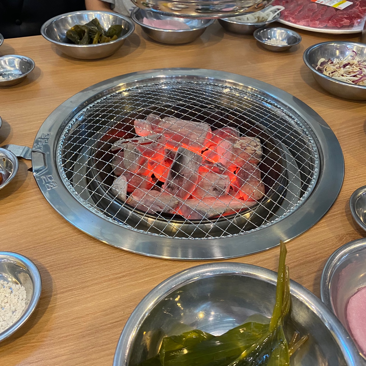 숯불에 고기를 구워먹는 방식이에요!