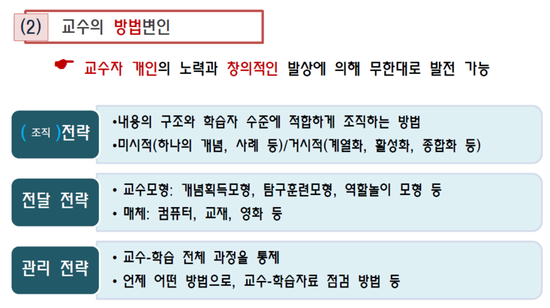 - 조건 변인을 고려한 최적의 다양한 전략을 선정하고 활용한다.