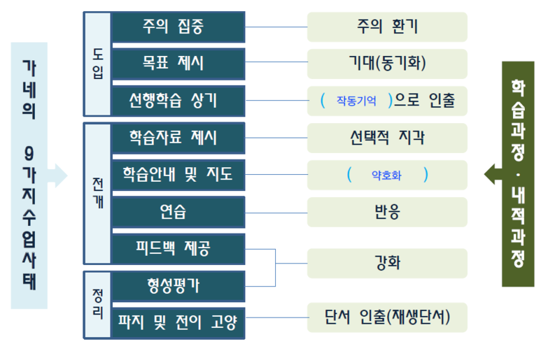 - 가네가 학습자의 내적 학습 과정 9가지를 제시했다.