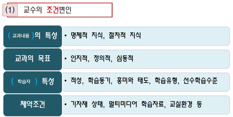 - 체계적인 교수 설계 행위가 이루어지기 위해서 반드시 고려해야 하는 변인을 의미한다.