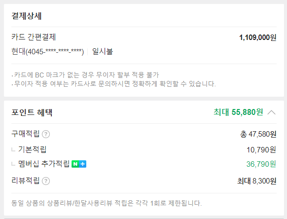 캐시백으로 카드포인트 포함해서 10만원 정도 되서 실 결제금액은 백만원이었어요~