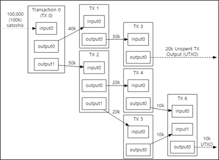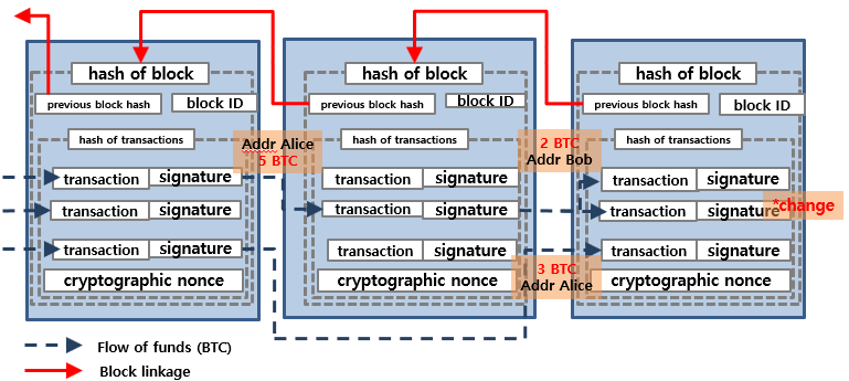 - 출력으로는 출력인덱스, 코인량(금액), 수신자주소(공개키해쉬)를 기록한다.