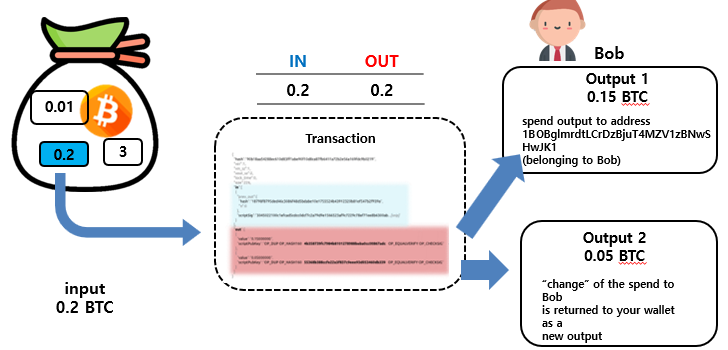 - 위와 같은 경우에는 0.2 비트코인이 0.15 비트코인은 송금, 0.05비트코인은 다시 돌아와 UTXO가 된다.