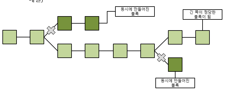 * 추후에 네트워크 상태에 따라, 위의 블록체인이 추가된것이 더 길어진다면, 위의 것이 올바른것으로 재변경 된다.