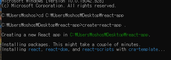 2. cd react-app 폴더 경로 : 폴더를 명령 프롬프트로 드래그하면 자동으로 경로 출력