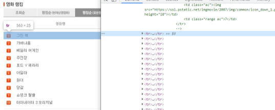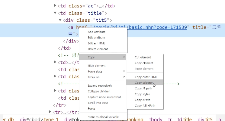 이때는 다시 네이버 영화로 돌아가서 해당하는 영화제목 > 검사 > 해당 태그에 copy selector 를 사용한다.