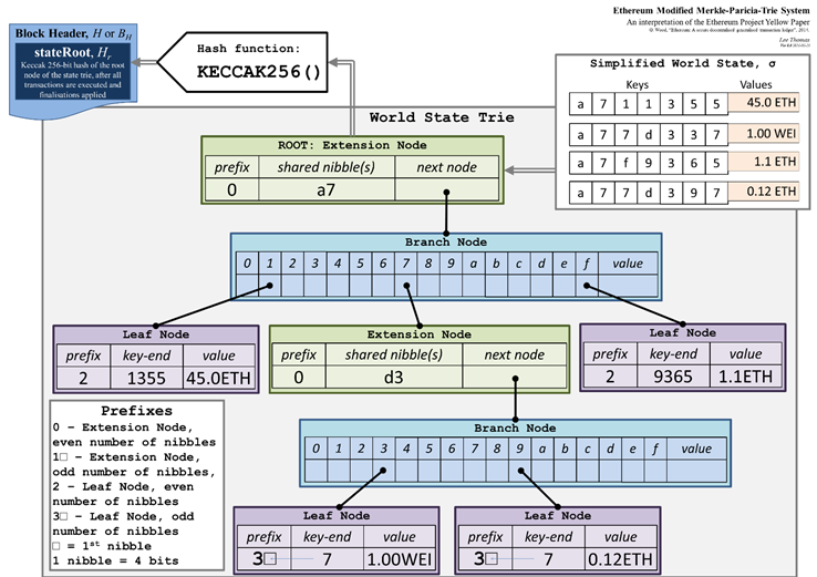 > 이더리움은 TX마다 State가 바뀌고, 10초마다 블럭이 생성되므로 머클트리로는 무리가 있음.
